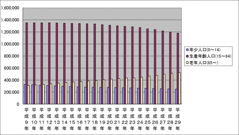 栃木県の人口を年少人口(15歳未満)、生産年齢人口(15歳以上65歳未満)、老年人口(65歳以上)の3区分に分けると、総計では、年少人口は253,031人(12.70%)、生産年齢人口は1,211,942人(60.85%)、老年人口は526,551人(26.44%)、日本人では、年少人口は249,711人(12.77%)、生産年齢人口は1,180,745人(60.37%)、老年人口は525,420人(26.86%)となりました。外国人では、年少人口は3,320人(9.29%)、生産年齢人口は31,197人(87.34%)、老年人口は1,131人(3.17%)となりました。