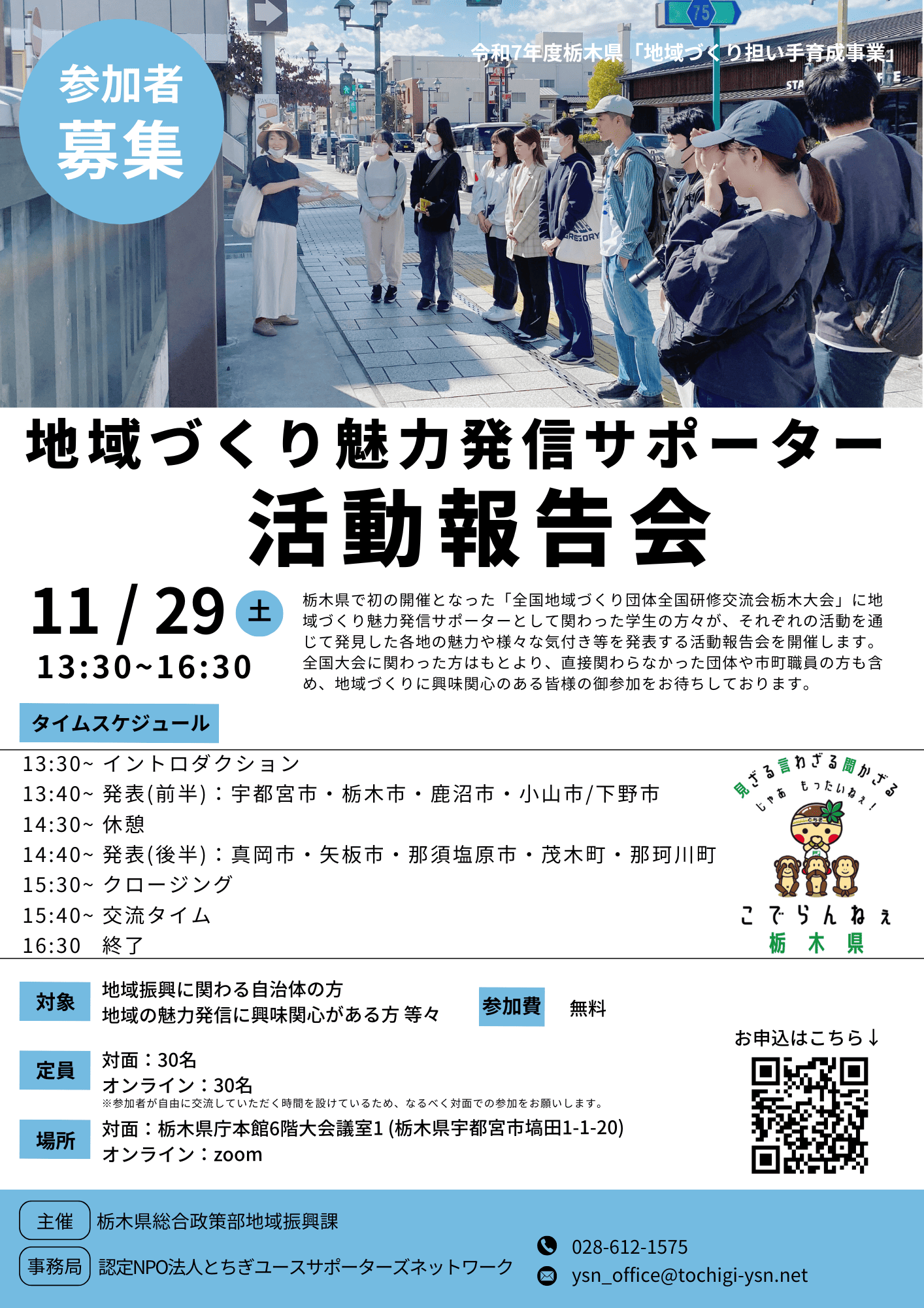 令和7(2025)年11月7日(金)~9日(日)に本県で初開催された「地域づくり団体全国研修交流会栃木大会」に魅力発信サポーターとして関わった大学生達が、大会準備・運営や参加者との交流等を通して発見した各地の魅力や様々な気付き等を発表する活動報告会を開催しますのでお知らせします。