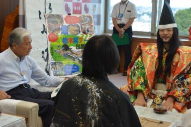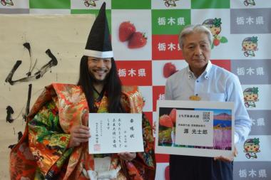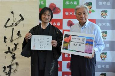 9月2日、筆を使わない墨絵師「指墨画家」の荒川 颼(あらかわ しゅう)さん、「武楽」創始家元の源 光士郎(みなもと こうしろう)さんが「とちぎ未来大使」に就任しました。