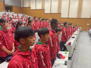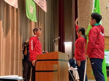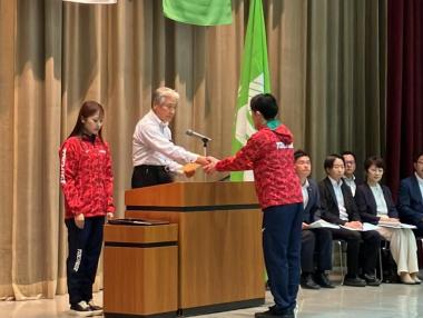 結団式には、34競技に出場する選手団のうち、約200名が出席しました。各競技の代表に指定証が授与された後、全国高校総体フェンシング男子エペで優勝した中浦秀哲(なかうら ひでのり)選手が、選手団を代表して団旗を受け取りました。