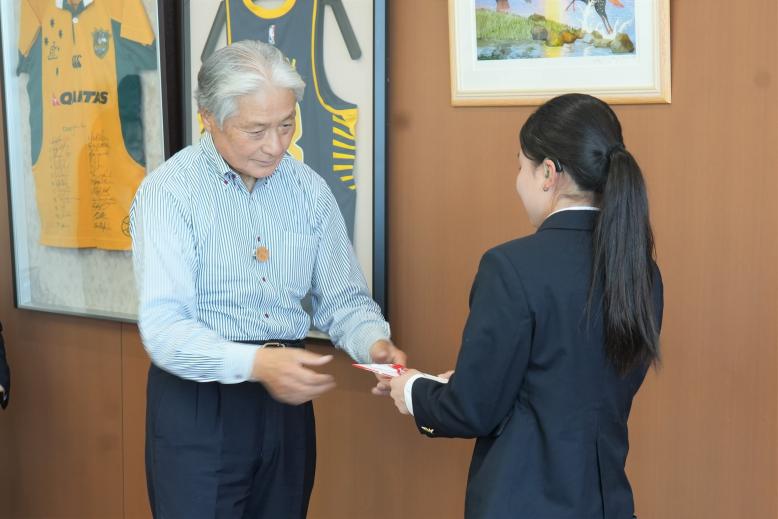 また、10月17日には、大会に出場する本県出身選手の知事激励会が開催され、知事から激励金が贈呈されました。知事を訪問したのは、サッカーに出場する増田 香音(ますだ かのん)選手と、ゴルフに出場する辻 結名(つじ ゆうな)選手です。