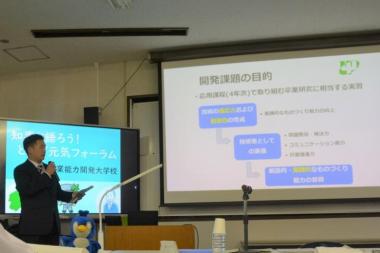 意見交換の前に、「生産機械システム技術科」の斎藤さんと、「建築施工システム技術科」の佐藤さんから、大学校で取り組まれている開発課題等について報告が行われました。