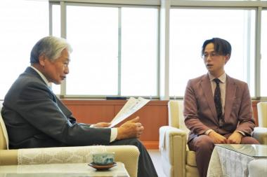 就任後の歓談で、いちご狩りや田植えの手伝いなど、配偶者の実家での農作業に携わり、地域との関わりを深めている小野島さんに対し、福田知事は、とちぎ未来大使のための「とちぎ移住芸人“ファーマー”」という肩書きを提案しました。そして、「ぜひとちぎ移住芸人“ファーマー”として、今後ますます多彩な活動を展開していってください。」と、熱いエールを送りました。