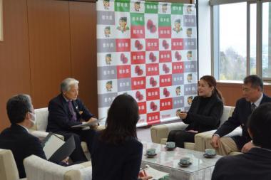 イガリさんが「とちぎをもっとハッピーにしていきたいです。」と意気込むと、知事は「メイクを通じてこどもたちに夢と希望を与えてください。」と期待の言葉をかけました。