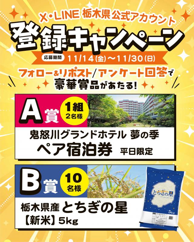 ホーム > 県政情報 > 県政の広報 > ホームページ・SNS > 【11月30日まで!】X・LINE公式アカウント「栃木県」登録キャンペーン実施中!