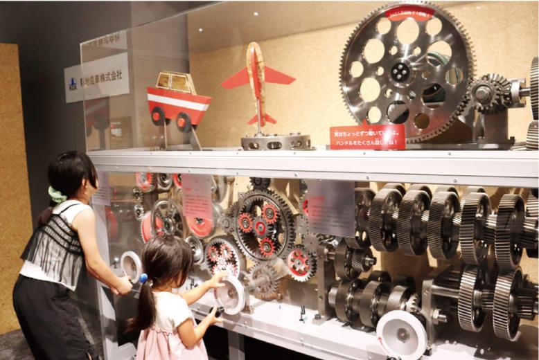 ハンドルを回して、約100個の歯車が動く仕組みを体験