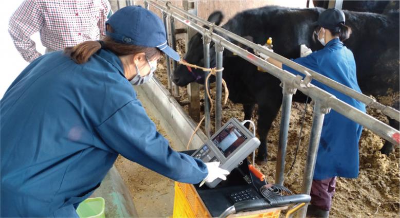 県では、農業団体と協力しながら、農家を訪問して肉質の向上に取り組んでいます。超音波を活用して肉牛の発育状況やサシの入り具合を診断するなど、技術面で生産者をサポート!こうした取組の積み重ねが、とちぎ和牛の確かな品質と深い味わいを生み出しています。