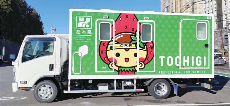 この車(くるま)には、きれいで安全(あんぜん)に使(つか)えるトイレが備(そな)え付(つ)けられていて、地震(じしん)や台風(たいふう)、大雨(おおあめ)などの災害(さいがい)で、家(いえ)や学校(がっこう)のトイレが使(つか)えなくなった時(とき)に活躍(かつやく)するよ。