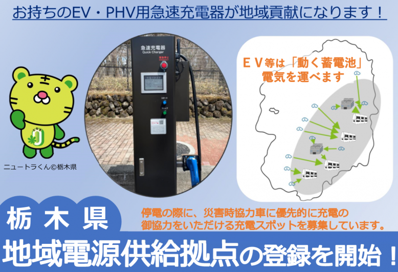 「災害時のレジリエンス強化」及び「EV普及を通じた脱炭素化」を図るため、県内でEV・PHV用急速充電器を設置している事業者等を対象に、災害時に栃木県災害時協力車登録制度に登録されたEV等に対して、優先的に充電の御協力をいただける充電スポットを募集し、当該急速充電器を「地域電源供給拠点」として、登録します。