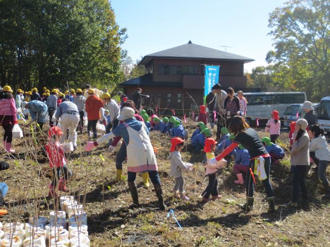 ホーマック株式会社社員と烏山保育園、聖マリア幼稚園の園児、壬生町立壬生北小学校の児童及び関係者120名が参加して、協定面積0.40haのうち、約0.10haにヤマザクラやコナラなど約360本を「カミネッコン」を使用した「バイオブロック工法」で植栽しました。