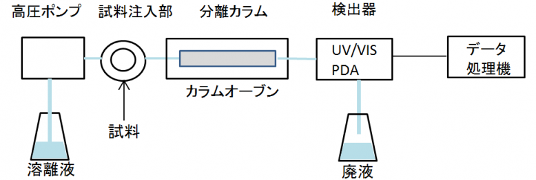 この装置は、「高圧ポンプ」、「試料注入部」、「分離カラム」、「検出器」、「データ処理部」から構成されています。