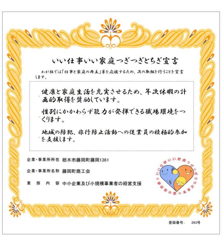 ホーム > 産業・しごと > 雇用・労働 > 労働環境 > 「いい仕事いい家庭つぎつぎとちぎ宣言」事例 > 「いい仕事いい家庭つぎつぎとちぎ宣言」事例(小山) > 藤岡町商工会