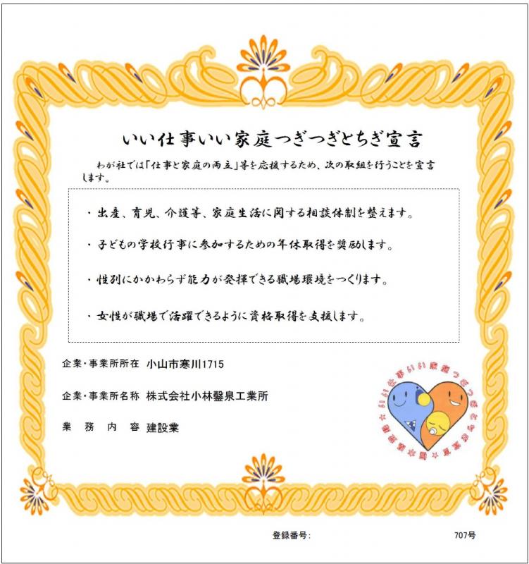 ホーム > 産業・しごと > 雇用・労働 > 労働環境 > 「いい仕事いい家庭つぎつぎとちぎ宣言」事例 > 「いい仕事いい家庭つぎつぎとちぎ宣言」事例(小山) > 株式会社小林鑿泉工業所