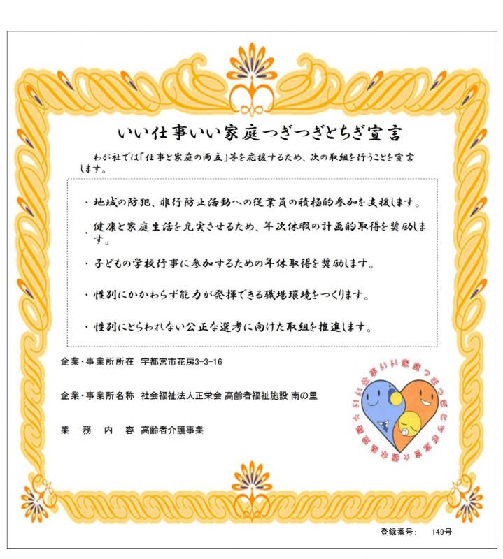 ホーム > 産業・しごと > 雇用・労働 > 労働環境 > 「いい仕事いい家庭つぎつぎとちぎ宣言」事例 > 「いい仕事いい家庭つぎつぎとちぎ宣言」事例(宇都宮) > 社会福祉法人 正栄会 高齢者福祉施設 南の里