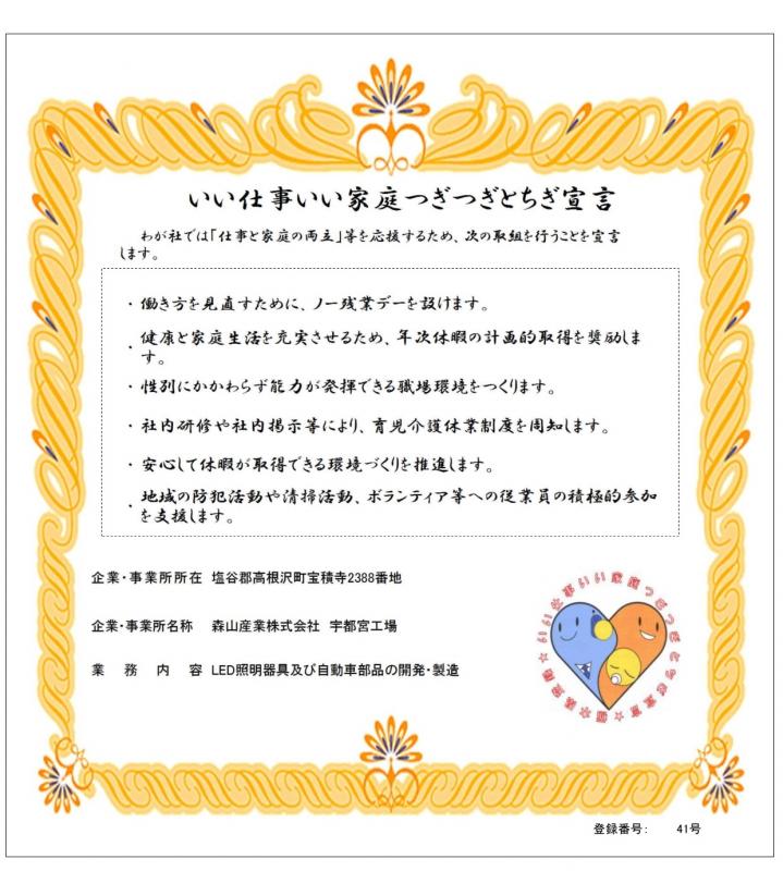 ホーム > 産業・しごと > 雇用・労働 > 労働環境 > 「いい仕事いい家庭つぎつぎとちぎ宣言」事例 > 「いい仕事いい家庭つぎつぎとちぎ宣言」事例(宇都宮) > 森山産業株式会社宇都宮工場
