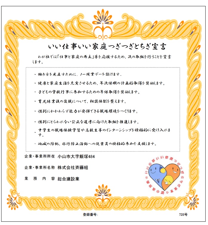 ホーム > 産業・しごと > 雇用・労働 > 労働環境 > 「いい仕事いい家庭つぎつぎとちぎ宣言」事例 > 「いい仕事いい家庭つぎつぎとちぎ宣言」事例(小山) > 株式会社斉藤組