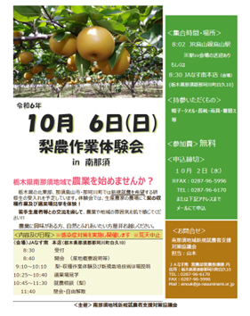 栃木県南那須地域(那須烏山市、那珂川町)での新規就農を希望する方に向けて、梨の農作業体験会が令和6年10月6日(日曜日)にJAなす南管内の梨園で開催されます。