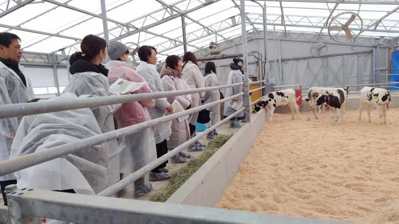 ホルスタイン預託育成事業の概要の説明を受け、哺乳舎や育成舎を視察し、参加者からは寒冷期や暑熱期の対策、敷料や牧草、疾病の予防などについて質問があがりました。