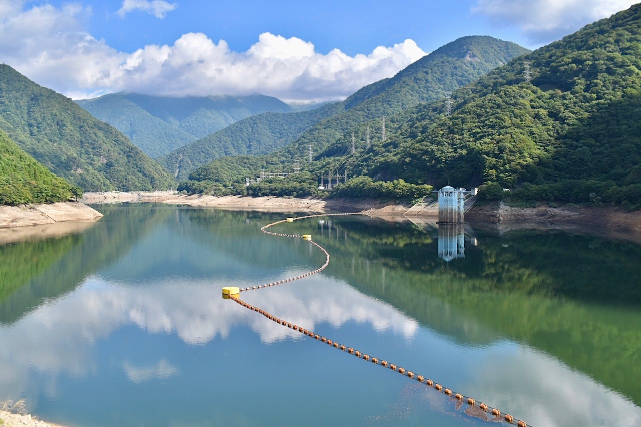 深山ダムと山々、風景が鏡のように湖面に映る |