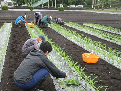 はじめての作業は、4月・5月に種を播いておいた、にんじん、だいこん、スイートコーンの間引き作業でした。