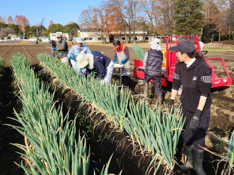基礎研修では、4月の実習第1回目に種をまき、8か月間かけて育てたねぎを収穫し、土付きのままで出荷しました。根を切らずに土が付いたまま出荷する「土付きねぎ」にすることで、もう一度地植えして長く保存することが出来るため、消費者に大変好評な出荷方法です。次々に袋詰めし、たくさん出荷することが出来ました。また、一部は、根や皮をむいて通常のねぎとしても調製し出荷ました。