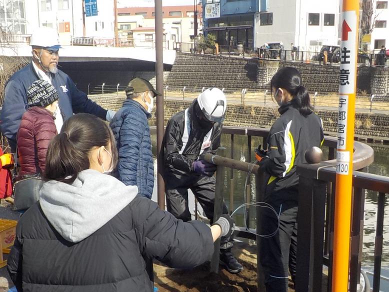 (造園建設業協会の方に支柱と横木を針金で結束するやり方を教わる様子)