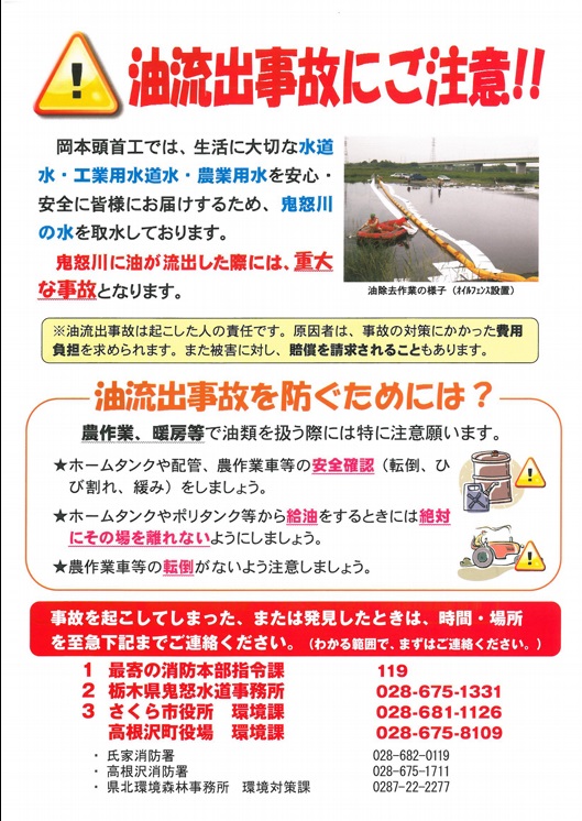 令和2(2020)年5月26日に、油流出事故防止啓発活動として、さくら市役所、髙根沢町役場、ガソリンスタンドにチラシ等を配布しました。