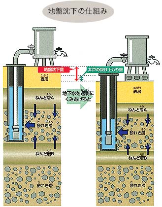 県南地域の平野部は、地下水を汲み上げすぎると地盤沈下が起こりやすい地質になっています。夏季や渇水時期など地下水位の低下する時期には、地盤の沈下量が大きくなりますが、その後、地下水位が回復しても、地盤は完全には回復しない傾向にあり、その差が年間の地盤沈下量として現れてきます。