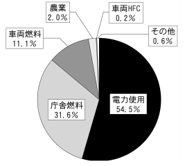 16年度の温室効果ガスの排出要因別割合は、電力使用が54.5%と最も大きく、次いでA重油・灯油などの庁舎燃料が31.6%、車両燃料が11.1%であり、15年度と比べて庁舎燃料使用の割合が増加している。