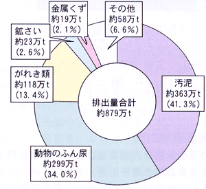 15年度の県内の産業廃棄物の推計総排出量は879万tであり、種類別にみると汚泥が363万tで最も多く、次いで動物のふん尿が299万tとなっています。