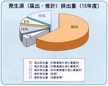合計排出量の発生源別内訳をみてみると、事業所(製造、販売、サービス業、農業等)からの排出割合が77%と最も多く、家庭からは8%、自動車等からは15%となっています。