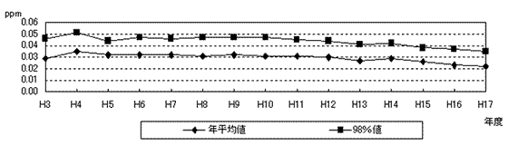 環境基準:日平均値0.04ppmから0.06ppmまでの範囲内またはそれ以下