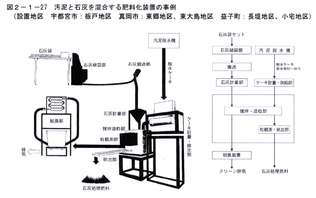 宇都宮市をはじめ、真岡市、佐野市、益子町、二宮町、芳賀町においては、汚泥と石灰を混合する肥料化装置(図2−1−27)やコンポスト施設により農地還元を行っている。