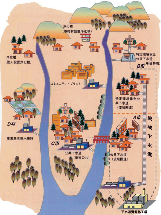 - 主に都市部の下水を処理して川へ流すもので、市町村が建設し、維持管理をしていますが、流域下水道に接続しているもの(流域関連公共下水道)もあります。