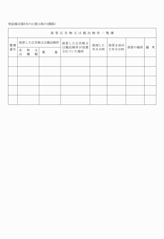 第13条の2 条例第21条の2第1項第1号の規則で定める場所は、保管した広告物又は掲出物件の放置されていた場所を所轄する土木事務所(以下「所轄土木事務所」という。)とする。