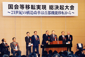 「国会等移転実現 総決起大会」が国会議事堂前の憲政記念館で開催されました。この大会は「構造改革は首都機能移転から」を副題として、移転先候補地3地域の国会議員連盟、知事、経済界が一致団結し、国会等の移転を早期に実現させるために開催したものです。大会には1,000人を超える参加者が集まり、会場は熱気に包まれていました。
